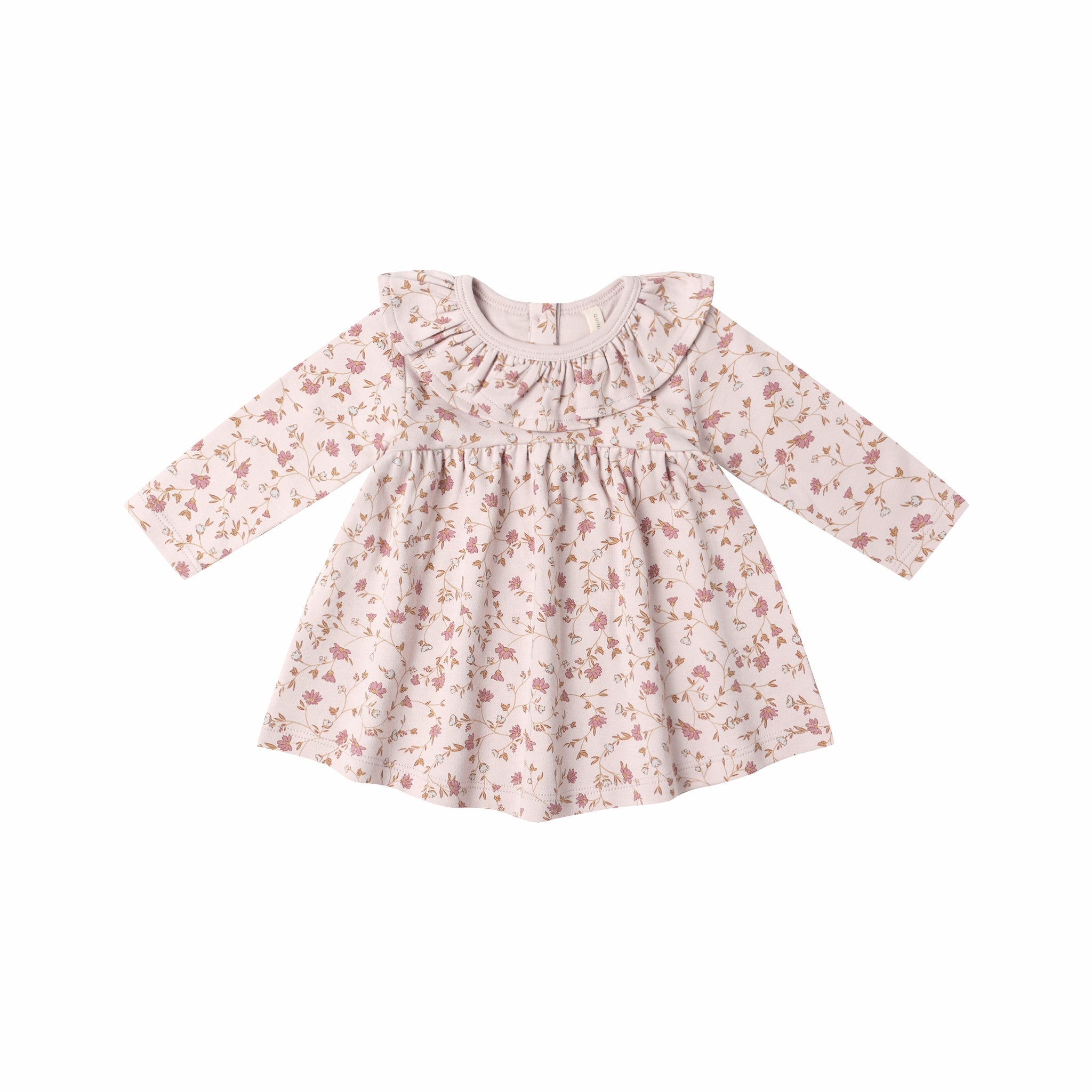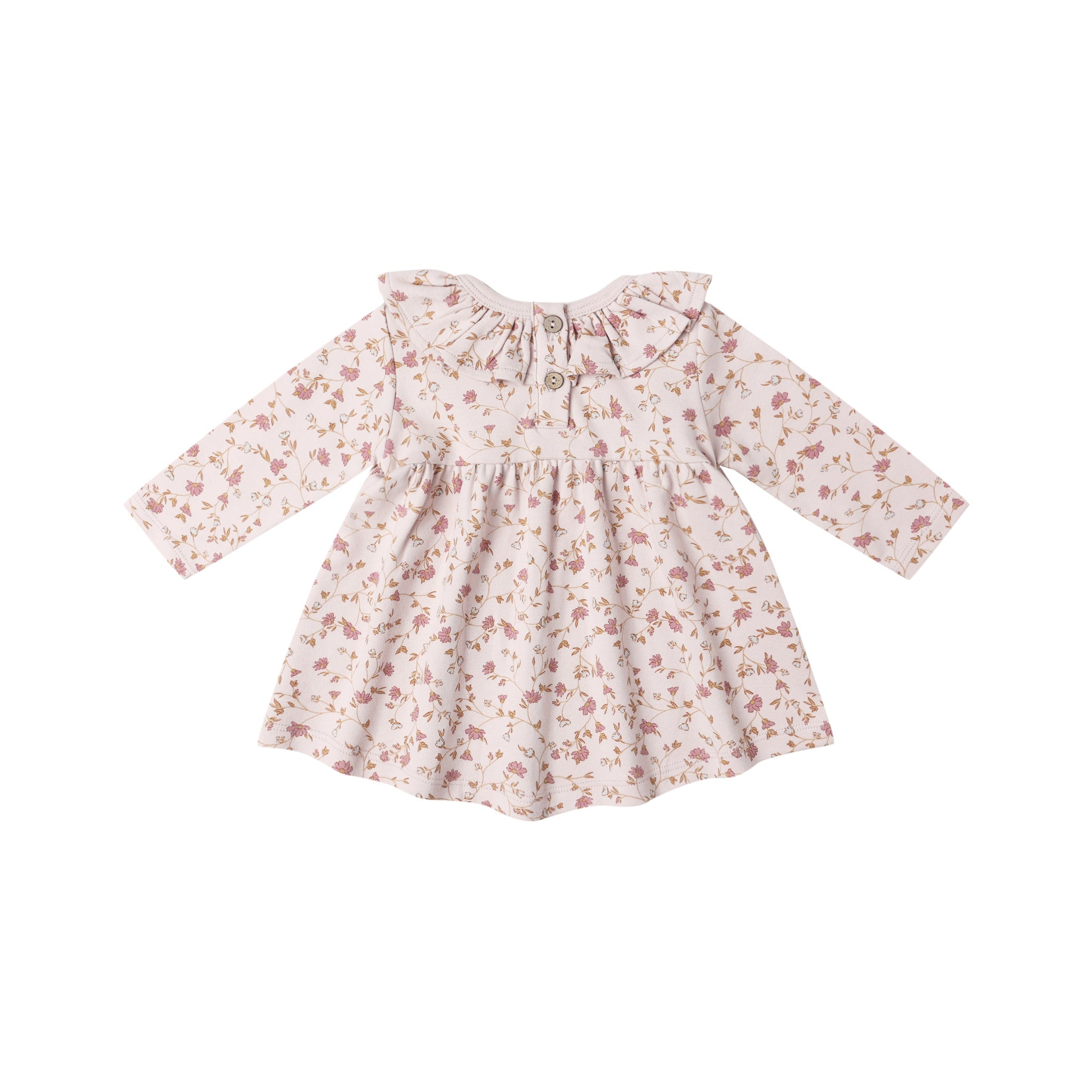 The Ruffle Collar Jersey Dress is a long-sleeved, light pink baby dress featuring a ruffled collar and garden print in muted pink and brown, crafted from soft organic cotton. Displayed against a white background.