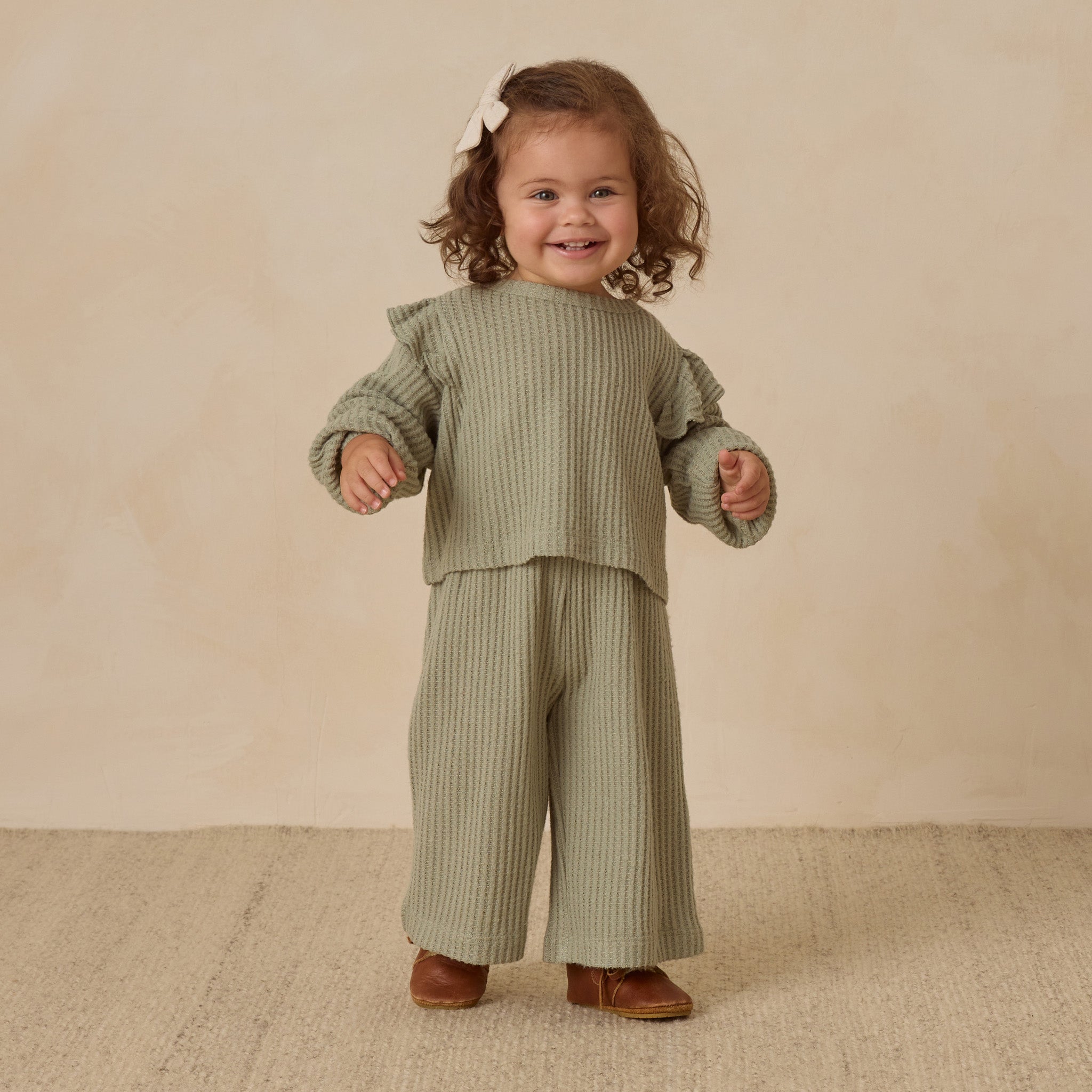 Made for cozy days, this darling set in our fuzzy waffle knit includes a long sleeve top with ruffle shoulder detail and wide leg pants featuring an elastic waistband and fixed cotton drawstring.