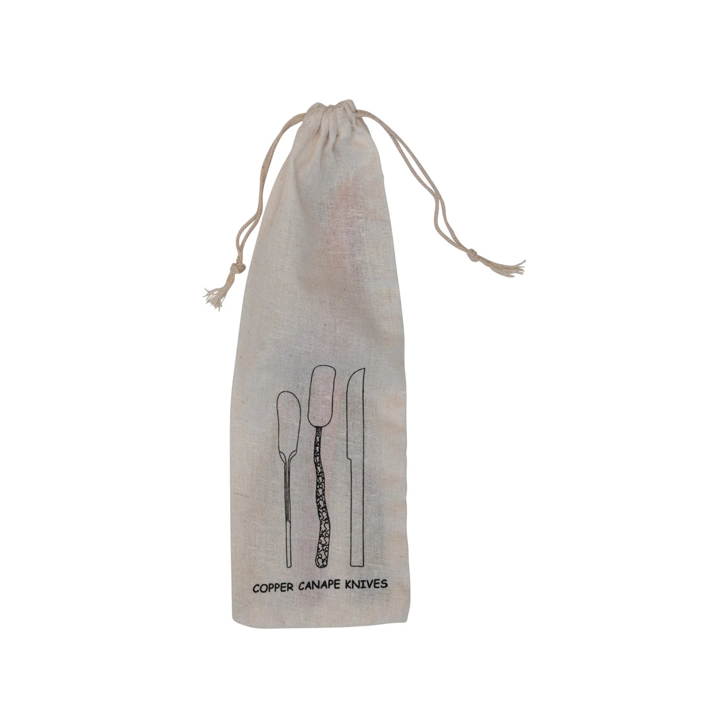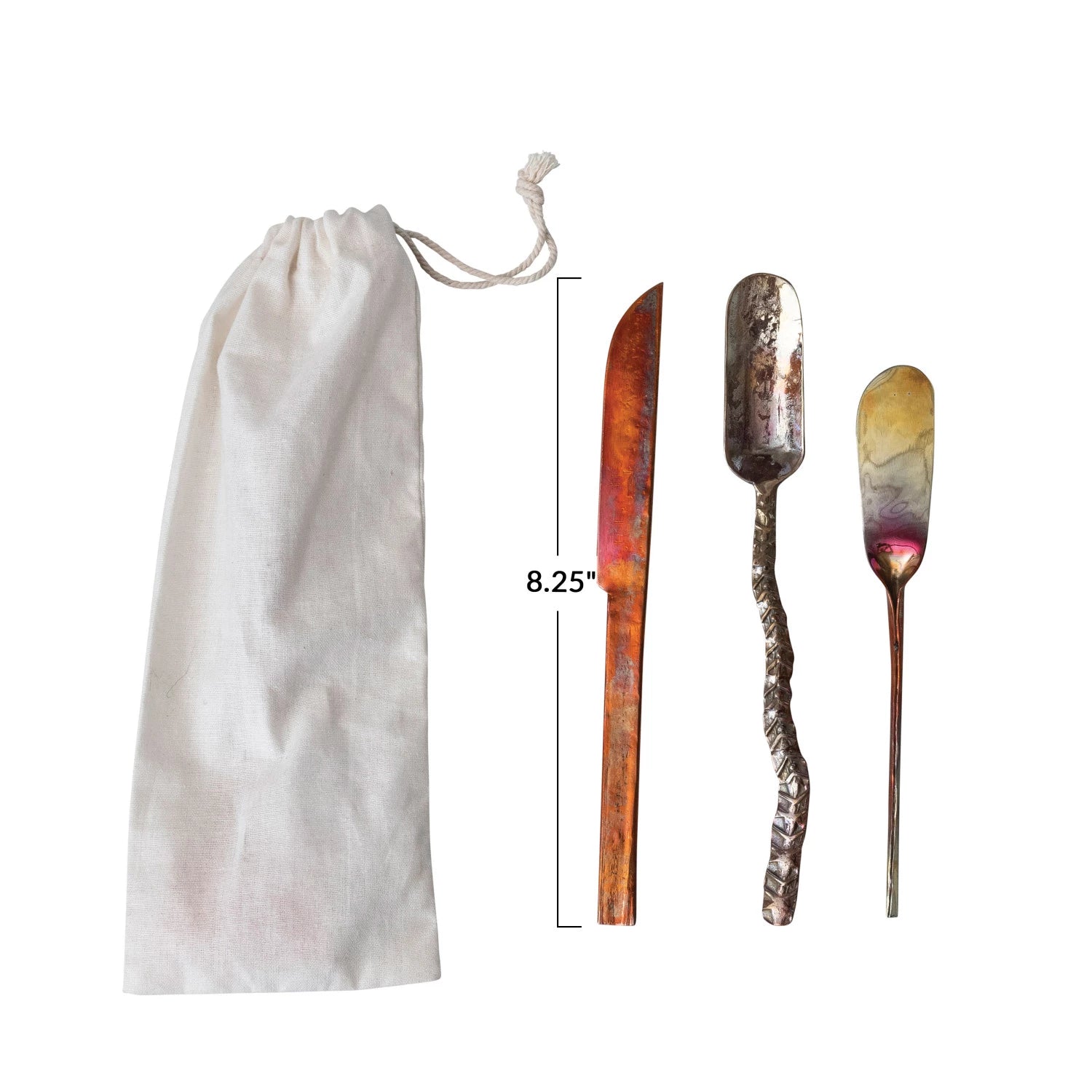 Take your serving to the next level with these super unique, forged copper canape knives! Measuring between 7" and 8.25" long, each knife is a different shape and color. These also go well in a housewarming gift!