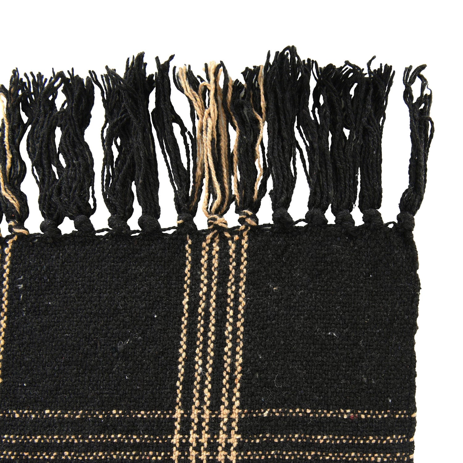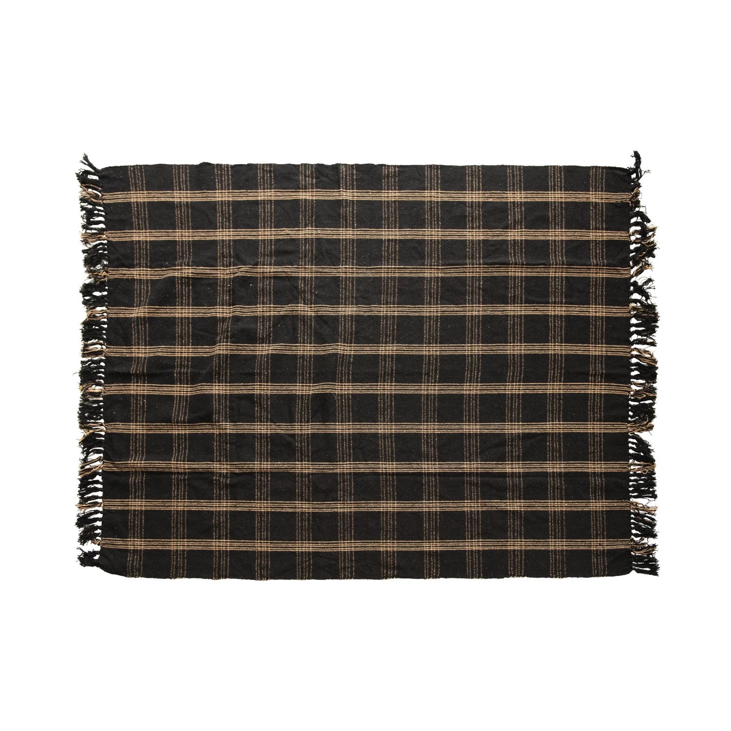 Add warmth and texture to the space with this woven reclaimed cotton blend throw with a cozy and stylish design. This throw is made of a reclaimed cotton blend, a recycled and eco-friendly fabric that provides comfort and durability. The throw features a black and tan plaid pattern that adds a touch of elegance and simplicity, while the fringe trim adds a touch of charm and personality to the throw. The throw is suitable for any space needing warmth and texture, such as the living room, bedroom, office, or any other area. It can also be an excellent gift for anyone who loves farmhouse, rustic, or traditional design. This throw measures 60 inches in length and 50 inches in width and is easy to care for. Simply machine wash cold, gentle cycle. Tumble dry low. Do not bleach, iron, or dry clean.