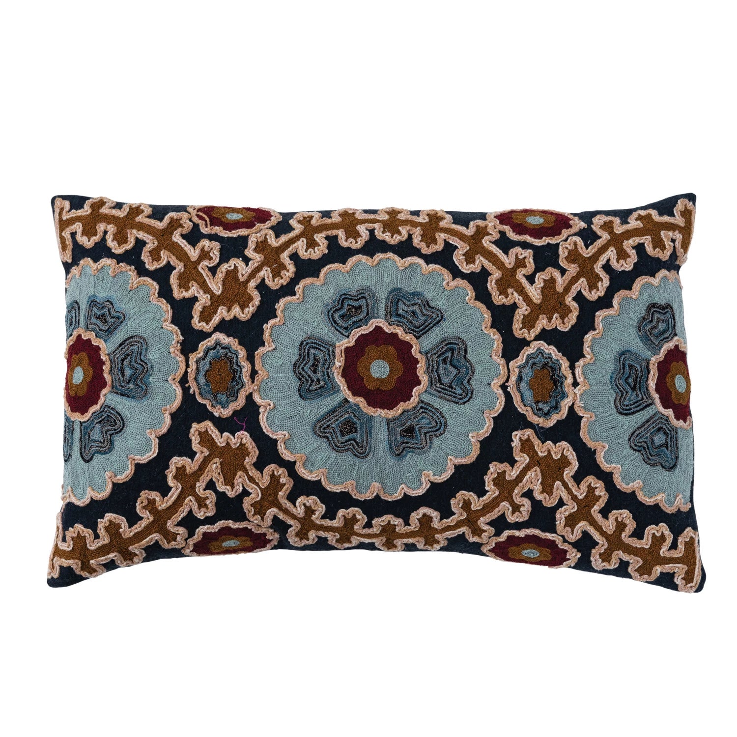 This multicolor cotton slub embroidered lumbar pillow with a chambray back perfectly adds a colorful style to the home. The soft yet durable fabric is ideal for everyday use, and the intricate embroidery adds a unique touch. The pillow features a back opening for easy insert removal and is machine-washable for easy care. It is also perfect for any room in the home, from the living room to the bedroom. Use it as a throw pillow on the couch, bed, or floor pillow to create a cozy seating area. It is also an excellent gift for any occasion. The cushion measures 24 inches long and 16 inches high. Whether used as a lumbar support on the couch or as a decorative accent on the bed, this quality pillow will make the home more beautiful and cozier. Polyester fill insert included.