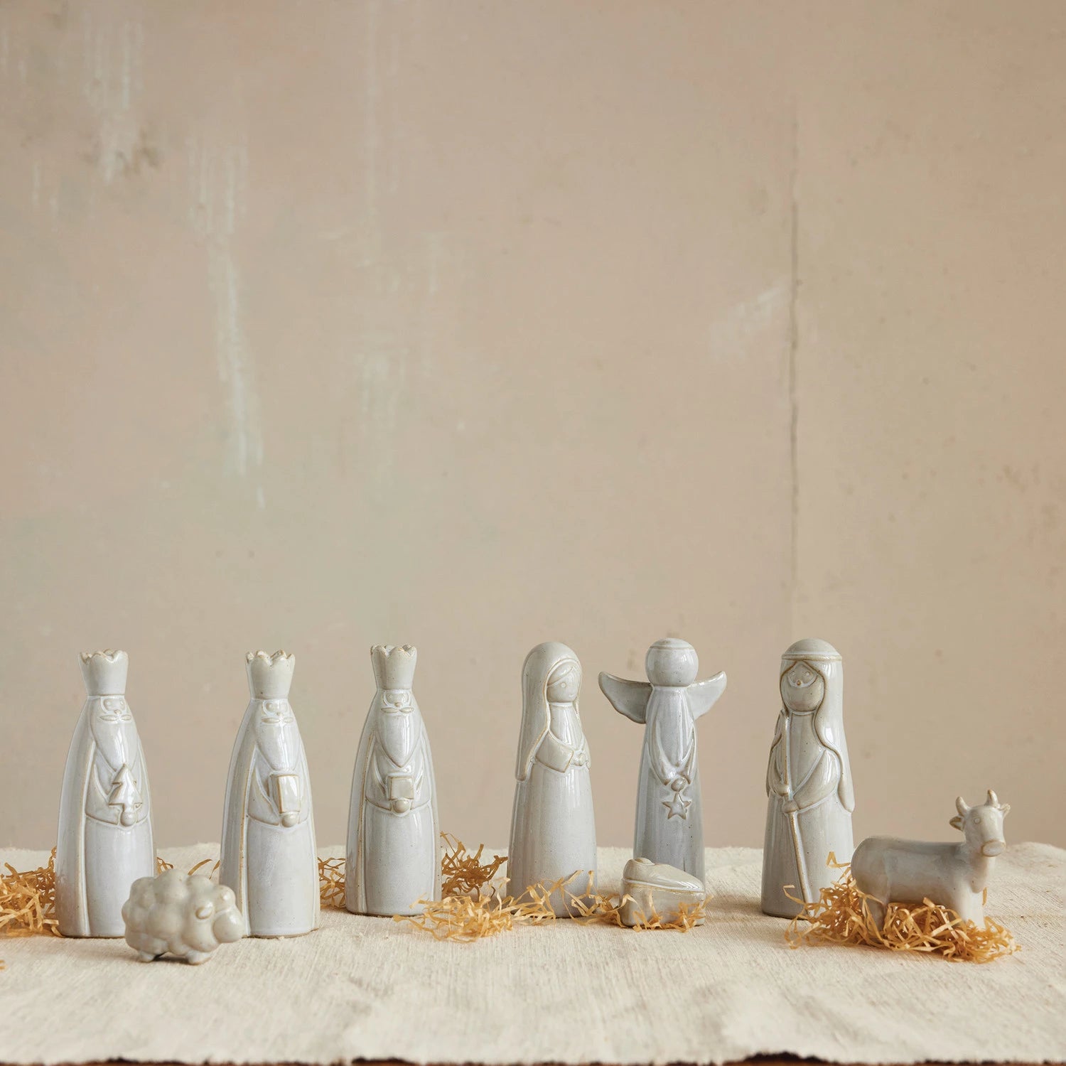 Bring the nativity story to life with this stunning handcrafted stoneware set! Featuring nine beautifully detailed pieces ranging from 1-1/2" to 6" in height, each figure showcases a unique reactive glaze finish in crisp white tones. The natural variations in the glaze create one-of-a-kind character for every piece, making your set truly special. Perfect for holiday displays, nativity scenes, or year-round spiritual décor, this artisan collection captures the warmth and reverence of the season with timeless elegance and authentic craftsmanship.