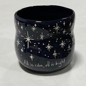 A twinkling sea of stars is hand painted around the deep blue-black base of the Alleluia Pot. The holiday hymn lyric "All is calm all is bright" is painted on the belly of the pot. Perfect for a small floral arrangement or giftable small plant